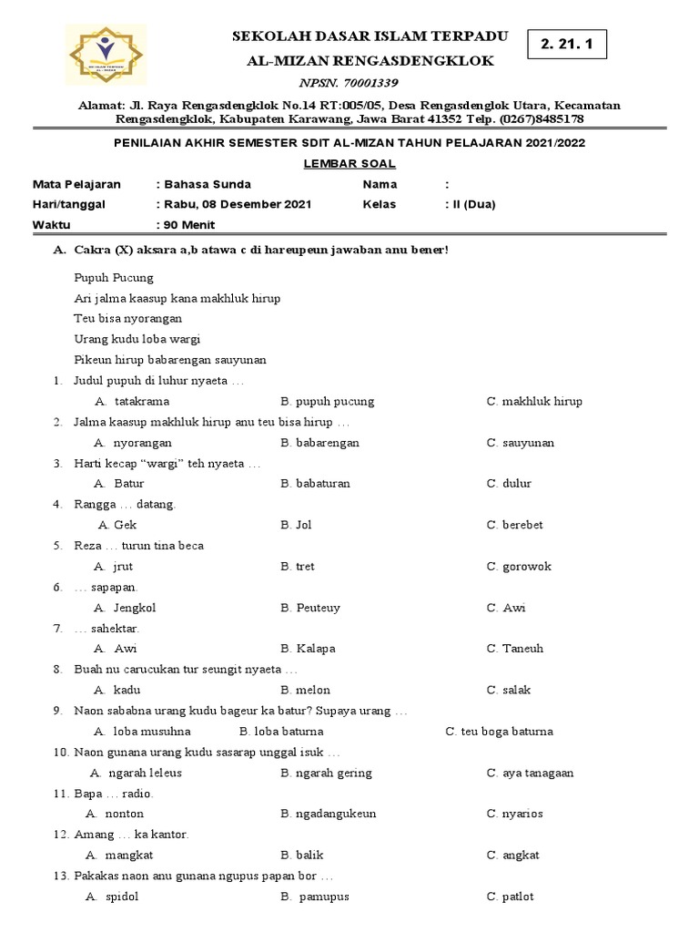 Conto Soal Basa Sunda Kelas 2 Semester 2